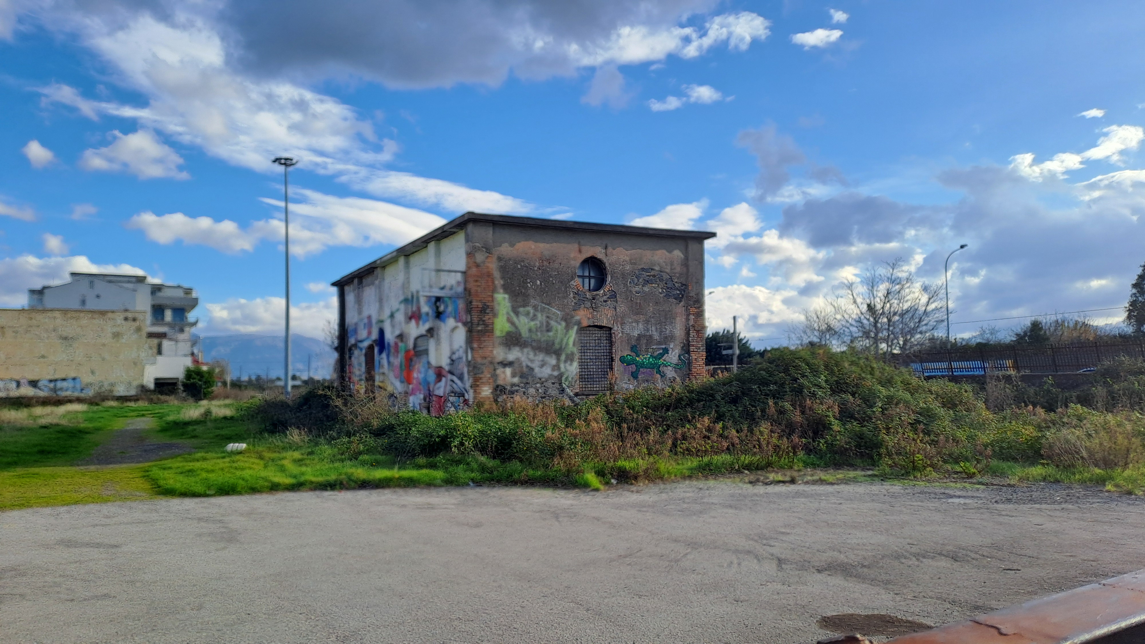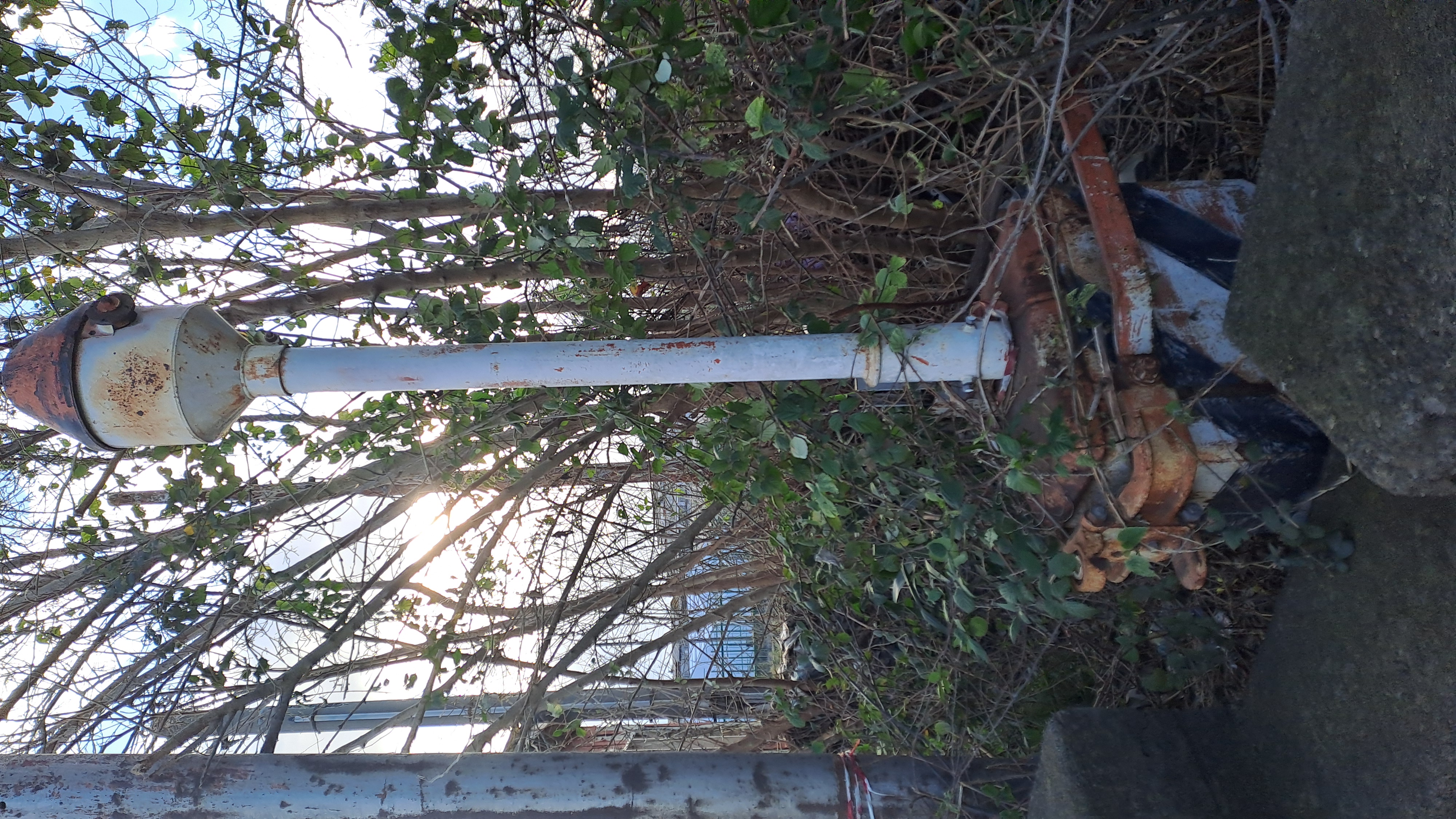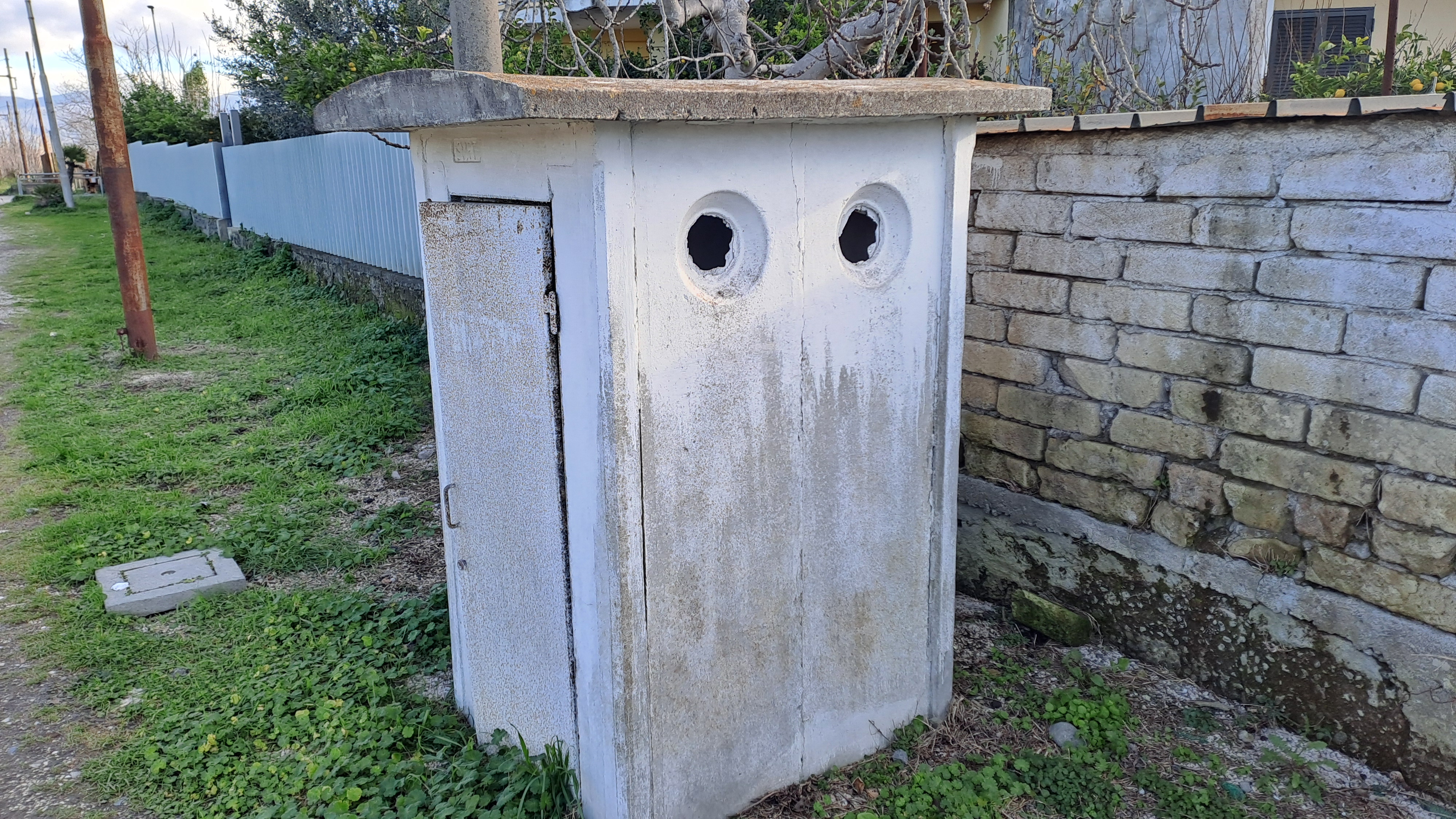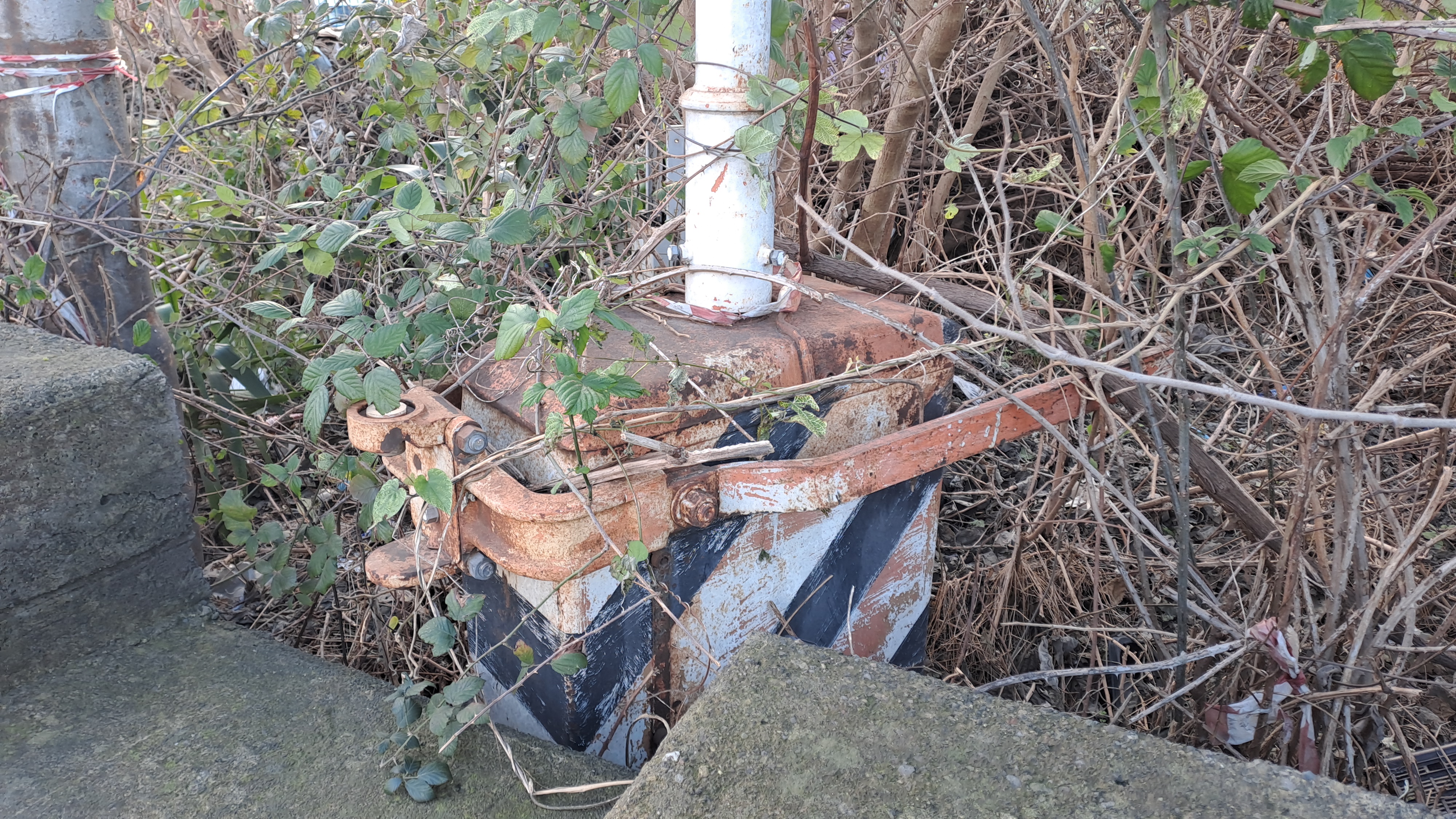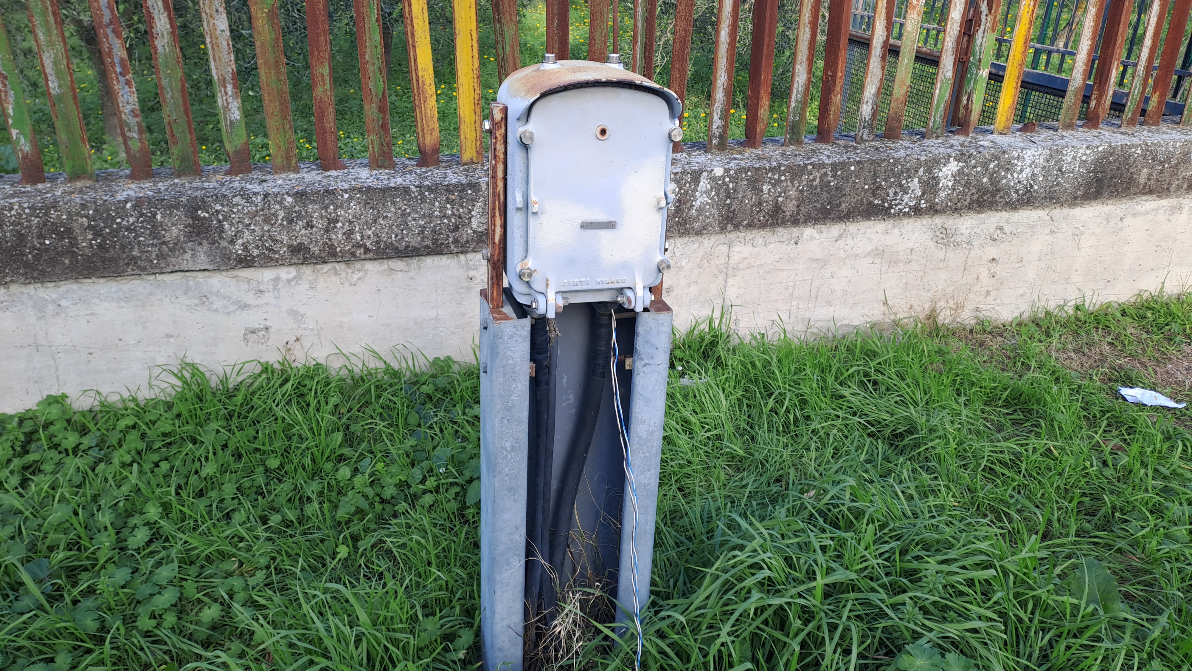 Torretta motorizzata per movimentazione sbarra del passaggio a livello tra la vegetazione.